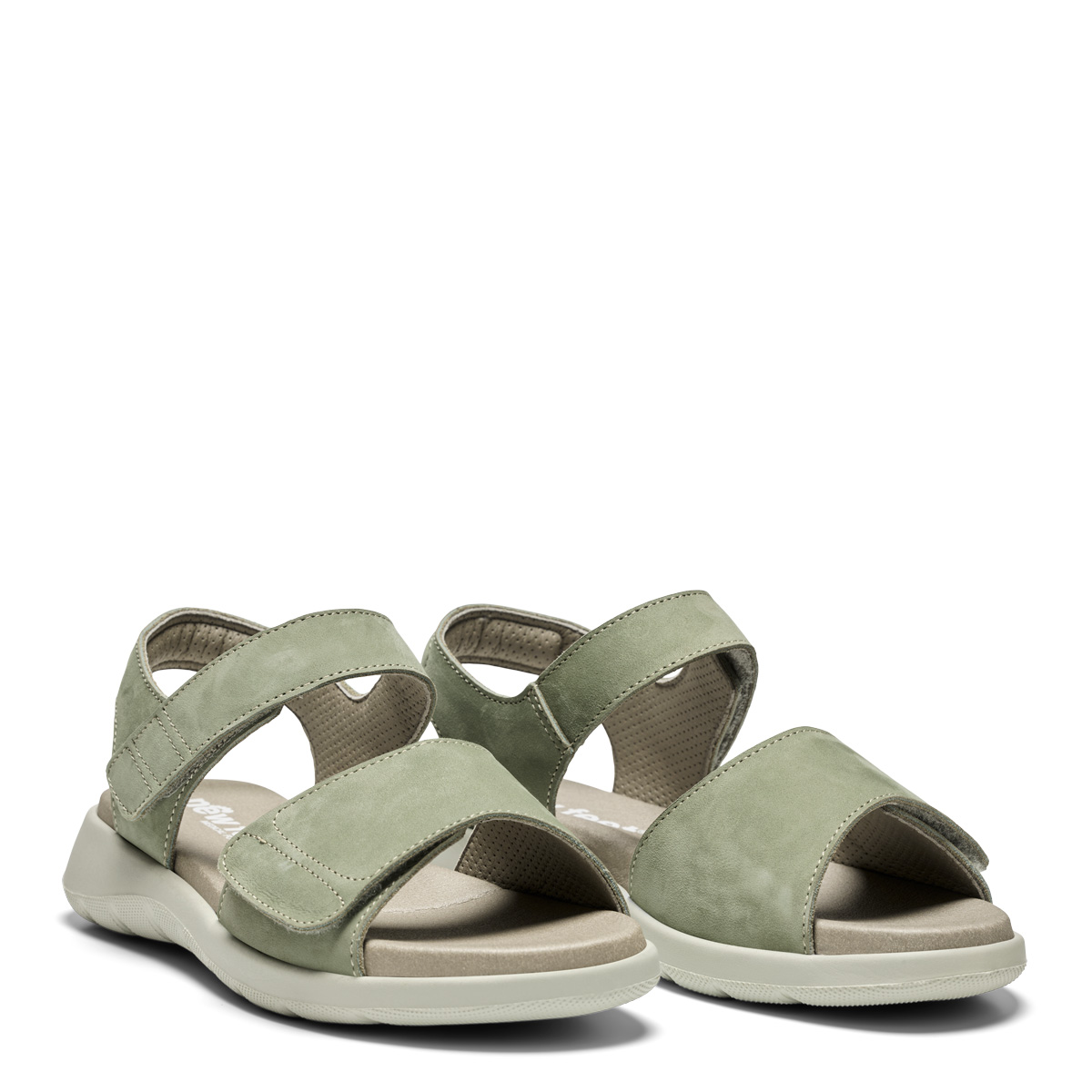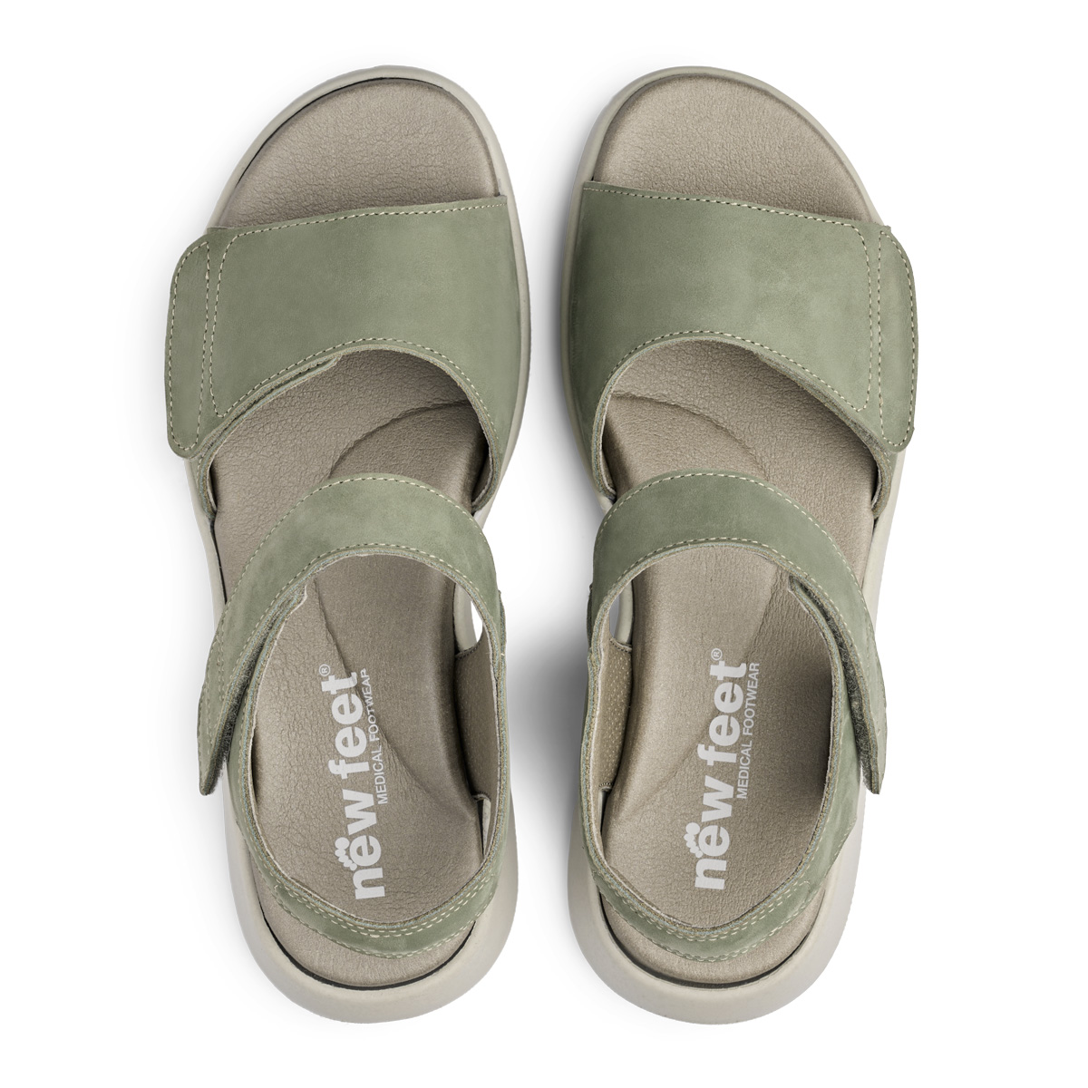 Damsandal med hälrem och twå kardborreband. EVA Yttersula med let rull funktion. Nubuck. Avtagbar 6 mm stötdämpande Protektor® innersula med hålfotsstöd.