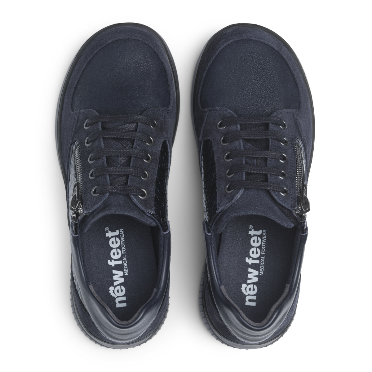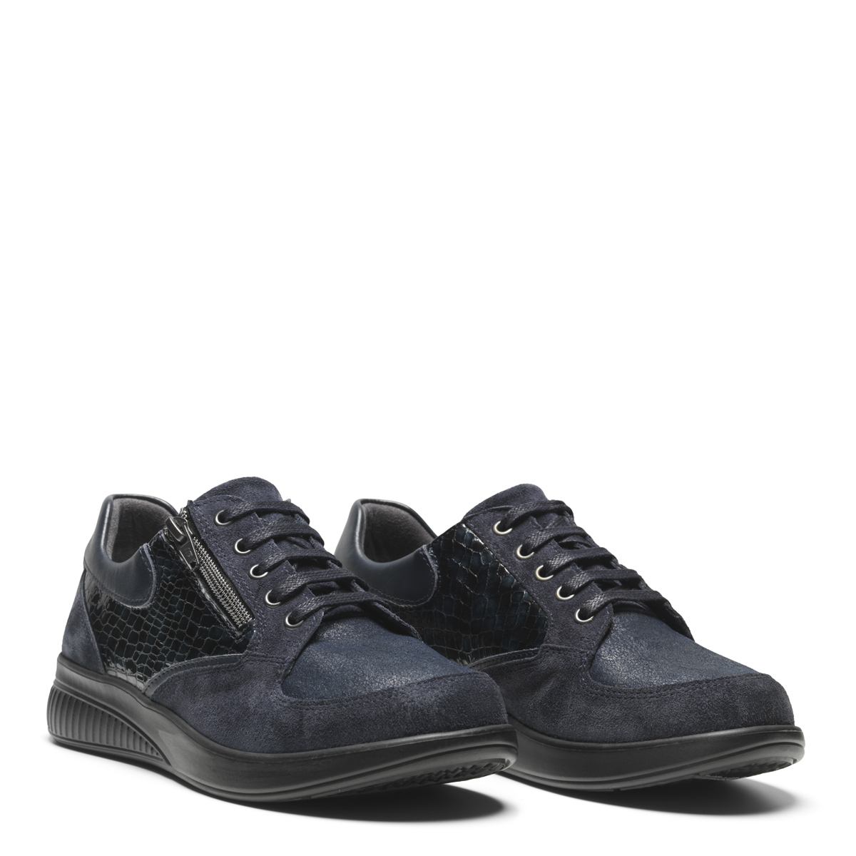Skor med snörning och blixtlås. Mocka och OrthoStretch®. Yttersula i EVA med medium vippfunktion. Häl lilft 30 mm - fall 17 mm. Löstagbar 6 mm stötdämpande Protektor® innersula.