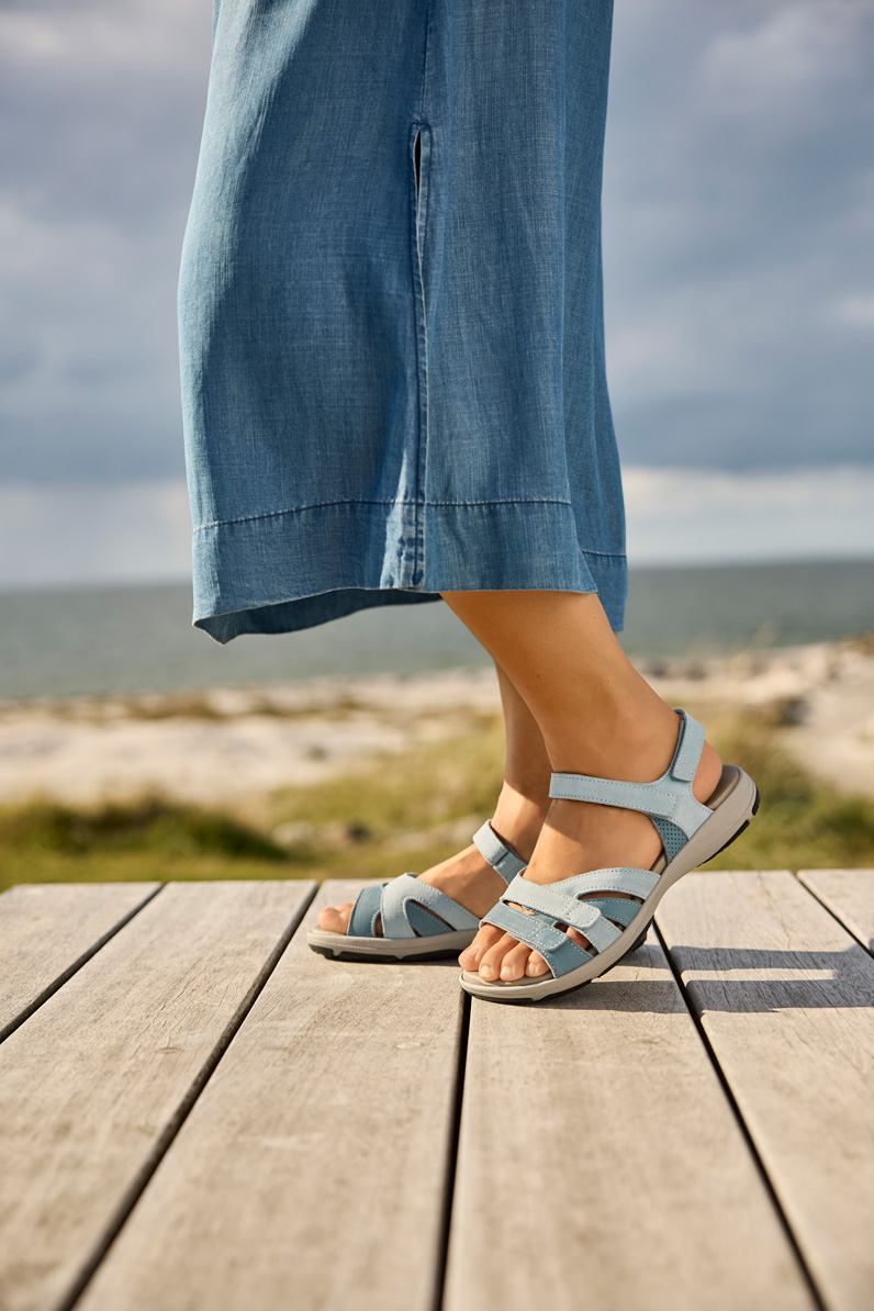 Damsandal med justerbar hälrem och tre kardborreband över framfoten.