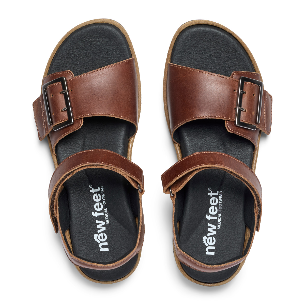 Damsandal från New Feet med hälrem, kardborreband och ett justerbart spänne så att du kan reglera passformen. Sandalen är tillverkad av förstklassigt genomfärgat slätt kalvskinn och har en mjuk OnSteam®-vaddering.