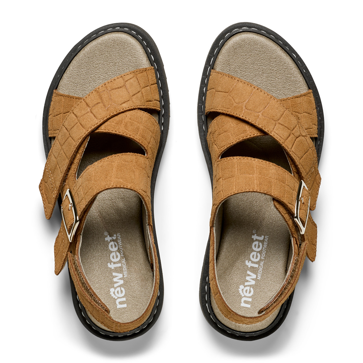 Damsandal från New Feet med två kardborrestängningar, ett dekorativt spänne och en justerbar hälrem.