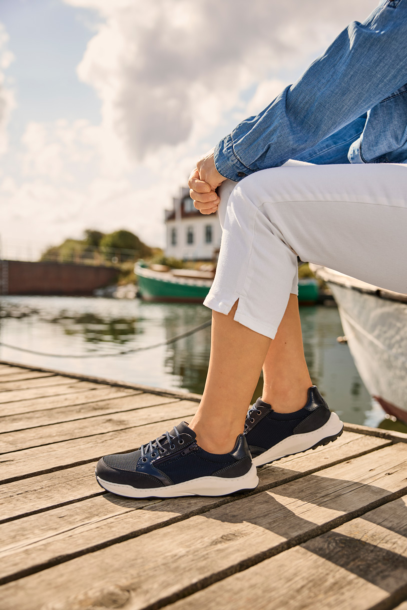 Snörskon med dragkedja är tillverkad i ett bekvämt meshmaterial med läderdetaljer i nubuck och slätt kalvskinn. Den sportiga damskon är vadderad med ett bekvämt textilfoder som är konstruerat med tillbakadragna, invändiga sömmar. Detta är en fördel för dig med känsliga fötter, så att du undviker tryck eller irritation.